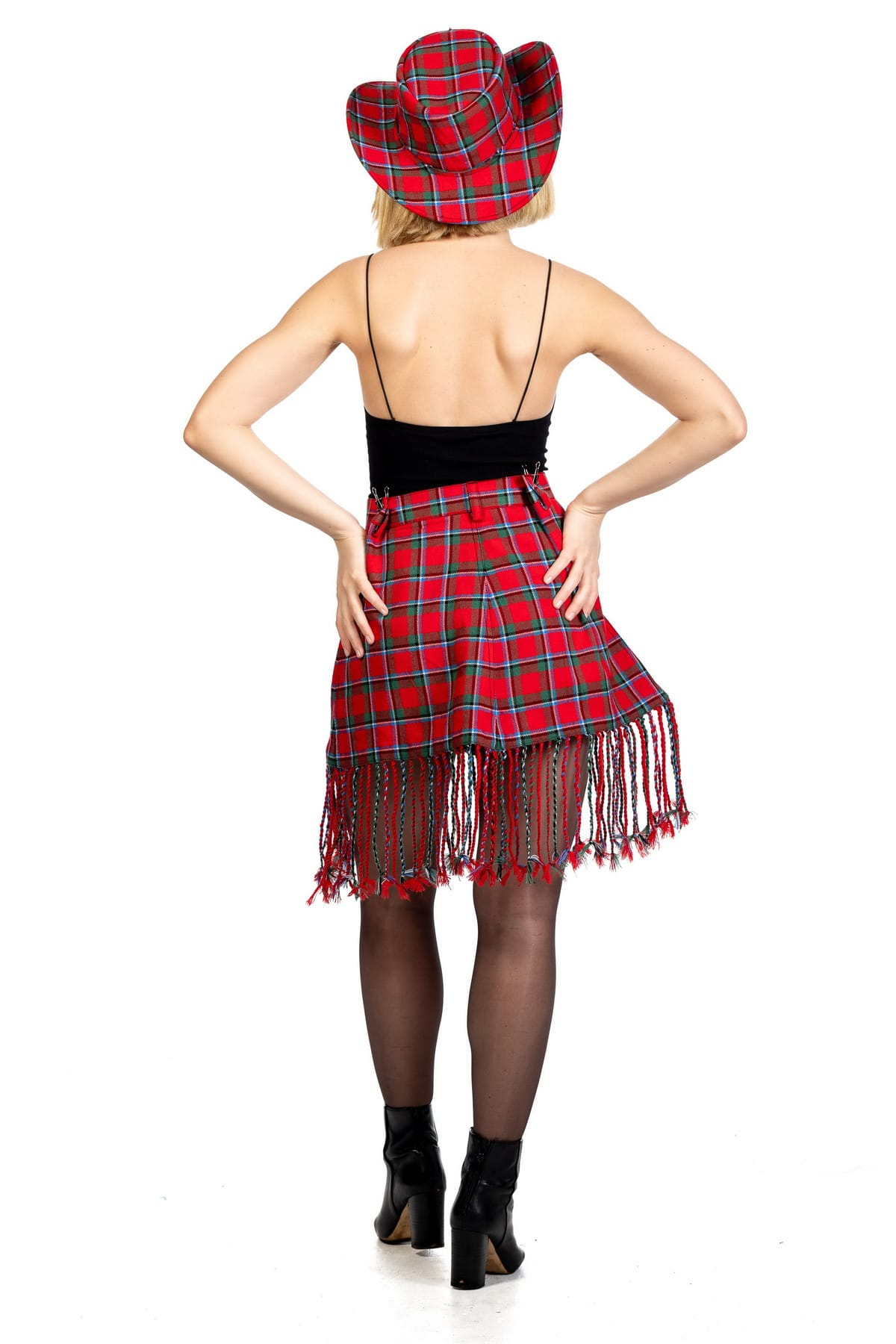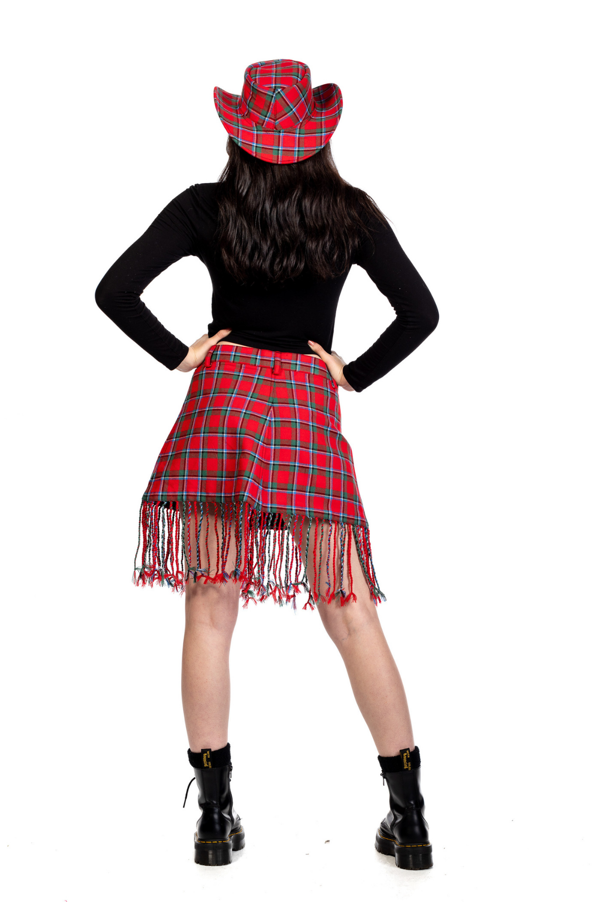 Design: Classic tartan plaid pattern with a modern twist and a fringe hemline for dynamic movement and style.